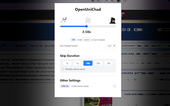 OpenUniChad는 Open University의 강의 비디오 플레이어의 사용자 경험을 개선하기 위해 설계된 무료 Chrome 확장 프로그램입니다. 이는 비디오 재생에 대한 더 많은 제어를 원하는 학생들을 위해 여러 가지 생활 편의 기능을 도입합니다. 주요 기능으로는 최대 5배의 조정 가능한 재생 속도가 포함되어 있어 사용자가 선호하는 속도로 학습할 수 있으며, 강의를 보다 효율적으로 탐색할 수 있도록 건너뛰기 지속 시간을 변경할 수 있는 기능이 있습니다.